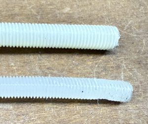 Prepping nylon rod to use to prevent the automotive glue from gumming up the threads of the captured nuts.